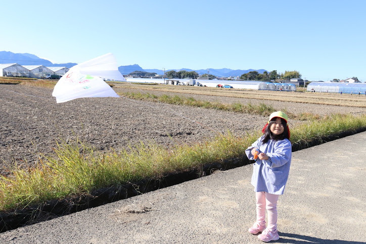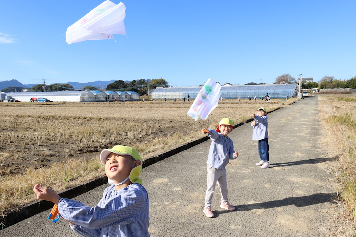 3歳児クラスは第二園庭・4歳児クラスと5歳児クラスは園の近くの農道へ出かけ、自分たちで描いたたこを持って広い場所でたこあげに挑戦しました。