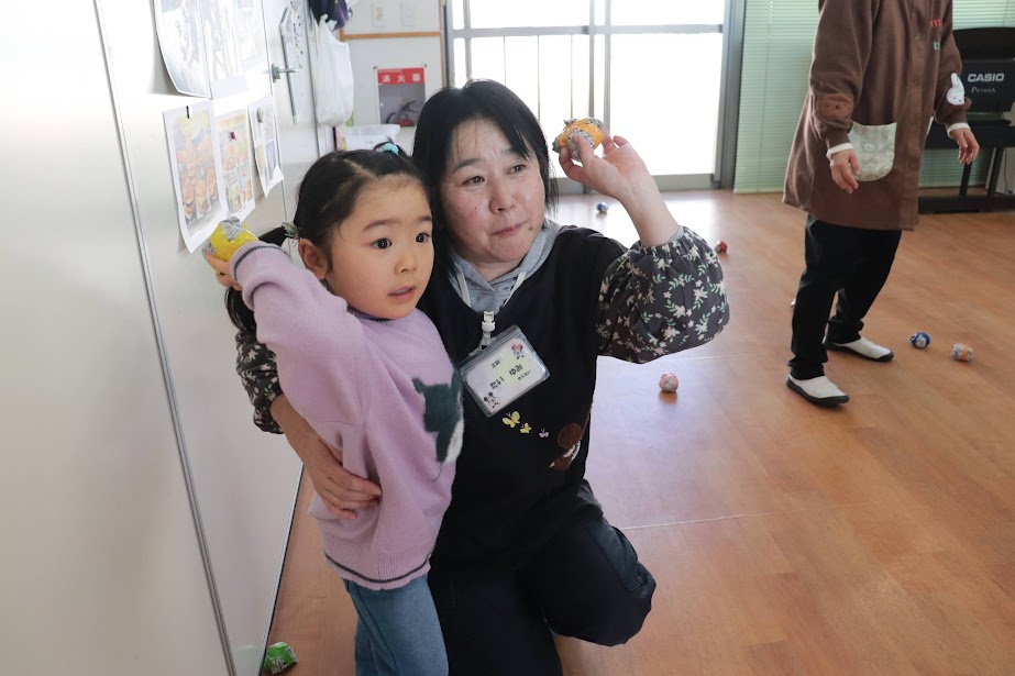 新聞紙ボールを豆に見立てて、「えいっ!」と投げながら、みんなで豆まきをすることができました。